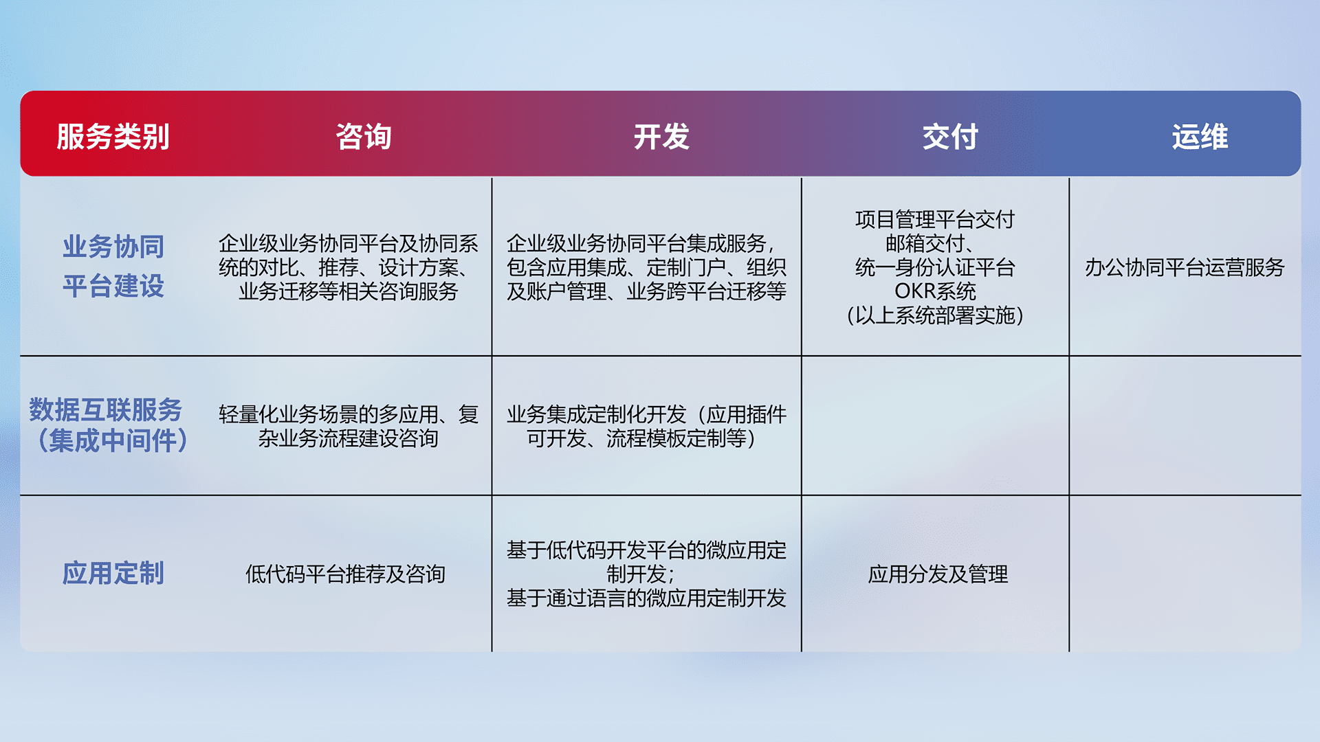 针对钉钉、、、企微、、、、IDaas等平台级产品提供产品的规划、、、方案、、交付、、、、定制化开发等服务,,,,实现如统一协同办公、、智能客户服务、、、混合会议管理、、、、智能数据查询、、、、等业务场景,,,,实现数字化转型。。。。